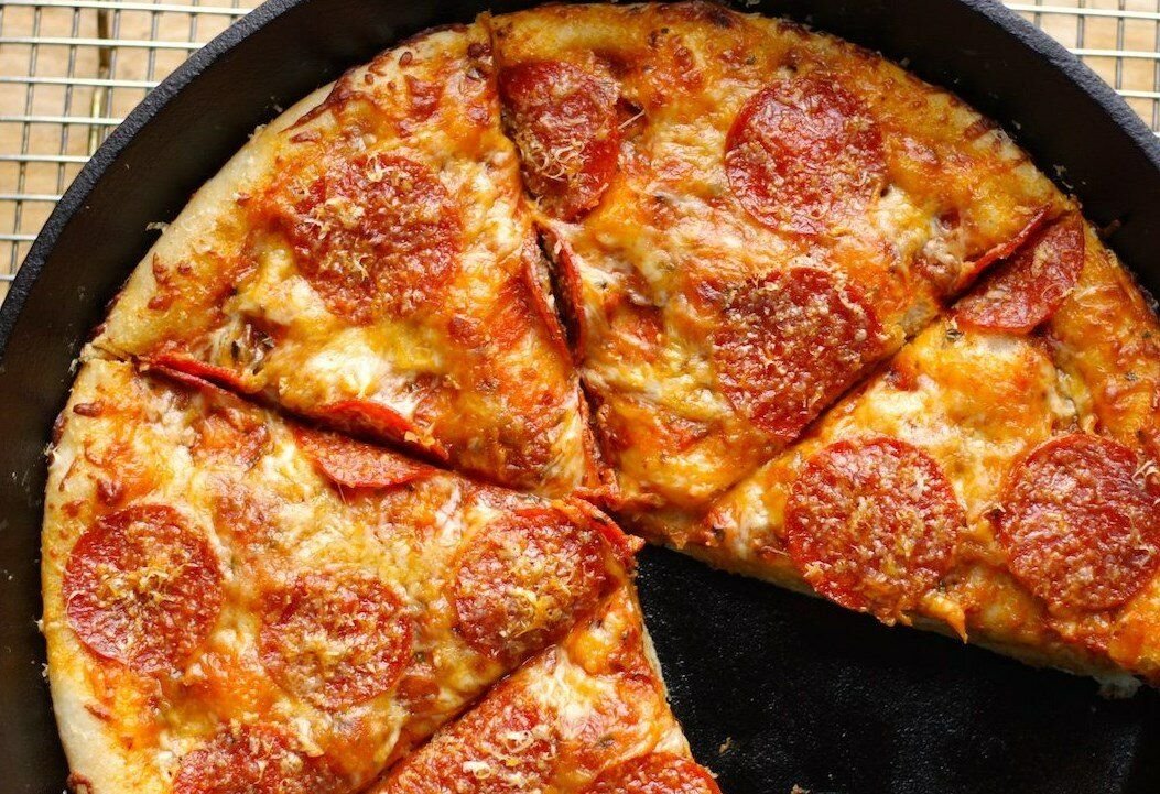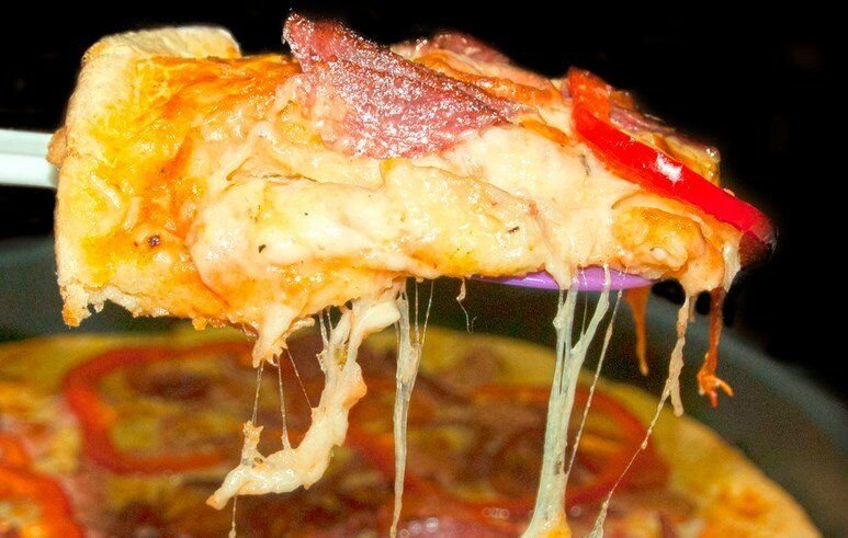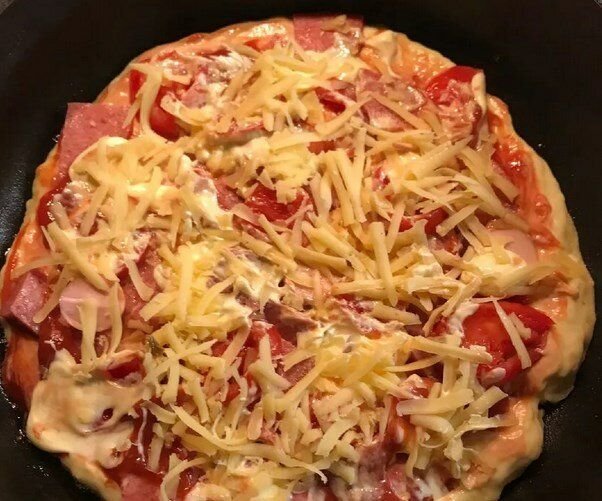 Включаем медленный огонь, сковороду закрываем крышкой. Минут за 10 пицца будет готова. Можно проверить готовность теста зубочисткой, если тесто к ней не липнет, значит, можно выключать плиту.