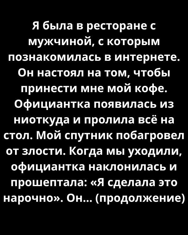Что-то глубоко внутри подсказывало мне, что это не просто человек, у которого был плохой день, — это был он настоящий. Официантка спокойно извинилась, хотя я заметила, как её глаза метнулись ко мне с чем-то, похожим на срочность. Мы закончили неловкий ужин в тишине, а когда мы уходили, официантка проскользнула мимо меня. Она наклонилась близко и прошептала, почти слишком тихо, чтобы услышать: