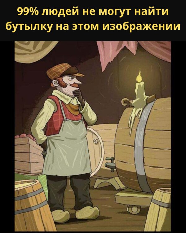 Вы думаете, что у вас орлиный глаз и безупречная концентрация? Этот тест проверит ваши способности! Задача проста: найти бутылку, спрятанную на картинке… но поверьте, это не так легко, как кажется. Готовы принять вызов и впечатлить своих близких?